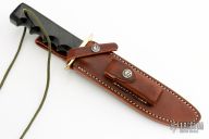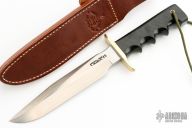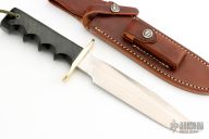 This Model 16 Special Fighter from Randall Made Knives has a satin finished stainless steel clip point blade with sharpened top edge, .223" blade stock and 1.286" blade depth, full tang construction. Handle has a black linen micarta handle brass guard and lanyard tube. Comes with brown leather sheath and original paper wrapping. New from maker at the 2023 Blade Show.