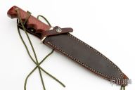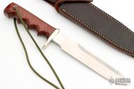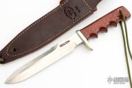 The Model 16-7 Diver was designed especially for heavy-duty salt water use and is as nearly indestructible as possible. This knife has a satin finished stainless steel blade with sawteeth and sharpened top edge and notched thumbrest, .214" blade stock and 1.178" blade depth, full tang construction. The handle has a nickel silver single guard, and red linen micarta handle with a brass lanyard hole. Comes with a Waxed brown leather sheath. Excellent condition.