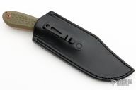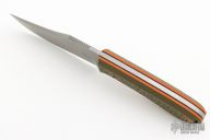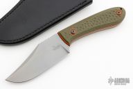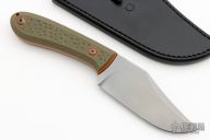 This Buccaneer by Patrick Doyle has a stonewash finished blade with false top edge and a notched thumbrest, thickness of .149" and a depth of 1.273". Full tang construction with green g10 scales, orange and black G-10 liners with lanyard hole, the tang and blade spine have an eggshell texture and the screws are stipple textured and bronzed. G10 collars. Knife comes with a black leather sheath with pocket clip made by Treeman Leather Shop. Comes with original box. New from maker!