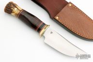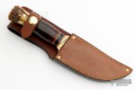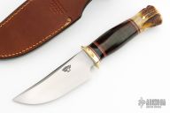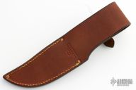 This Hunter by Jim Behring features a satin finished covex ground blade with 0.163" blade stock and 1.382" blade depth, hidden tang construction. The handle has a brass guard, stacked leather grip with black/red/brass spacers. Sambar stag butt plate. Comes with a brown leather sheath with ostrich panel. New from maker!