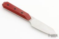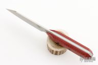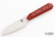 This Paring Knife by Goldenson Knives features a satin finished blade with .106" blade stock and 1.077" blade depth, full tang construction. The handle has red burlap micarta scales with gray G-10 liners and black canvas micarta pins. Comes with COA. New from maker at the 2023 Blade Show.
