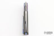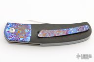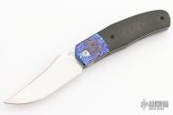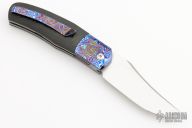 This STAN Front Flipper by Maxime Belzunce features a hand rub satin finished blade with notched thumbrest and front flipper. The handle has dovetailed mokuti bolsters, carbon fiber scales, bead blasted titanium liners, mokuti backspacer and tip up clip with hidden screws. Nice detent, lockup and blade seating. Comes with a felt case. New from maker at the 2023 Blade Show. Extremely well made folder!