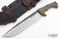 This Custom M-28 from Miller Bros. Blades features a two-tone blade with fullers and notched thumbrest, false top edge, .321" blade stock and 2.300" blade depth, full tang construction. The handle is comprised of carved green G-10 scales, textured tang. Lanyard hole on pommel. Includes kydex and brown leather sheath with belt loop. New from maker at the 2023 Blade Show.