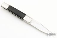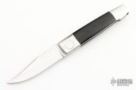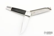 This Barry Wood swing lock folder features a satin finish blade and satin polished stainless steel frame with black linen micarta scales. This is a very unique scissor opening folder, which when the blade is fully open and locked in place is almost a fixed blade knife. The handle is nicely contoured for a comfortable grip. Opening is accomplished by lightly pressing down and outward at the rear indentation on the spine, which releases the locking pin and allows one side of the handle and the blade to rotate down then forward until the blade locks in the forward position. The one side of the handle continues to rotate back until it locks in place. Closing requires the same slight thumb pressure at the indentation to release the locking pin, then the one side of the handle is rotated back and around, catching the blade and aligning both with the other side of the handle in a locked closed position. Nice function. Has a few light scratches, otherwise good condition for age.