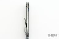 This Large Sebenza 31 from Chris Reeve Knives features a tumble finished drop point blade with dual anodized thumb studs and notched thumbrest. The handle has a bead blasted titanium frame over a single anodized barrel spacer with a matching bead blasted titanium tip up clip. Includes original box and COA dated November 17, 2022. Excellent condition.