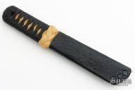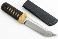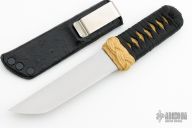 This Strongboy by Phill Hartsfield has a chisel ground tanto blade with a swedge and a black/tan cord wrapped handle, .250" stock and 1.218" depth, hidden tang construction. Comes with original sheath. Fine example of Phill Sr.'s work. Excellent condition.
