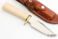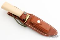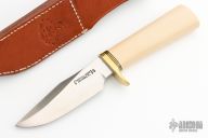 This Model 23 "Gamemaster" by Randall Made Knives features a satin finished clip point blade with sharpened top edge and a notched thumbrest, .221" blade stock and 1.284" blade depth hidden tang construction. The handle has a brass guard and an ivorite grip with black/brass spacers. Comes with original brown leather sheath and zippered case. Excellent condition.
