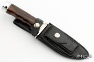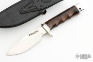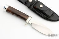 The Model 11 is the original drop-point blade. Designed by Tommy Thompson, noted Alaskan guide, in 1952 for big-game skinning, with point dropped below top of blade to prevent cutting too deeply through skins when used point first. This knife has a satin finished blade with notched thumbrest, .229" blade stock and 1.342" blade depth, hidden tang construction. The handle has a nickel silver guard, duralumin butt with lanyard hole, custom wood grip with finger grooves, white/duralumin spacers. Comes with a black leather sheath and a zippered case. Excellent condition.