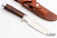 This Model 12-6 Little Bear Bowie by Randall Made Knives features a satin finished blade with notched thumbrest and sharpened top edge, .219" blade stock and 1.202" blade depth, hidden tang construction. The handle has a nickel silver guard and duaralumin butt, desert ironwood grip with black/duralumin spacers. Comes with a Johnson Roughback brown leather sheath and a zippered case. Excellent condition.