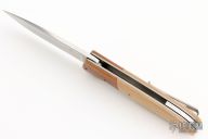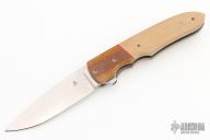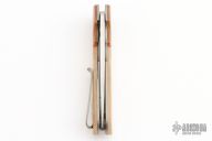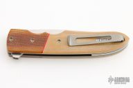 This Model 8 Flipper by Jason Clark features a stonewashed blade with a checkered flipper. The handle has natural canvas micarta dovetailed bolsters, tan linen micarta scales, bead blasted titanium liners, floating stonewashed stainless steel backspacer, tip up titanium clip. Rides on bearings, nice detent, lockup and blade seating. Comes with a leather slip sheath and COA. New from maker at the 2023 Blade Show.