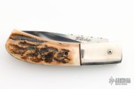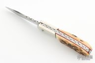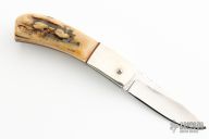This scale release auto by H Bishop features a mirror polished drop point blade with fileworked spine. The handle has nickel silver dovetail bolsters, stag scales with red liners, and stainless steel liners and fileworked backspacer. Has a few light scratches, otherwise excellent condition. Comes with a zippered case.