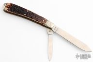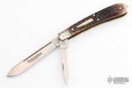 This Limited Edition Silver Bullet Knife by Remmington has two satin finished blades with nail nicks. The handle has engraved nickel silver bolsters, jigged bone covers, brass liners and steel springs.  Comes with a zippered. Excellent condition.