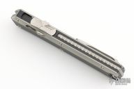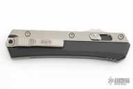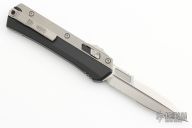 This Glykon by Microtech features a stonewashed double edged blade with fullers and notched thumbrest. The handle has a black aluminum chassis with bead blasted titanium overlays and tip down clip. Comes with original box and papers. Dated 04/2023 and #853. New from Maker at the 2023 BladeShow.