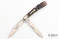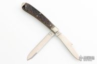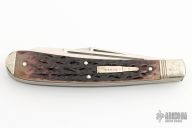 This Limited Edition Silver Bullet Knife by Remmington has two satin finished blades with nail nicks. The handle has engraved nickel silver bolsters, jigged bone covers, brass liners and steel springs.  Comes with a zippered. Excellent condition.