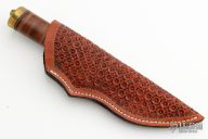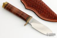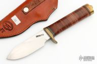 This A.G. Russell Special by Randall Made Knives has a satin finished blade with notched thumbrest, .162" blade stock and 1.209" blade depth, hidden tang construction. The handle has a stacked leather grip with brass guard and butt, black and brass spacers. Numbered 315 on blade spine. Comes with a hand tooled brown leather sheath, not original but fits nicely. Has a little patina, otherwise excellent condition. Coems with a zippered case.