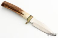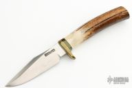This Model 8-4 by Randall Made Knives features a satin finished blade with sharpened top edge, .149" blade thickness, 1.017" blade depth, hidden tang construction. Especially suitable for small fish and feathered game. Brass guard and stag grip with black/brass spacers. Comes with a zippered case. Excellent condition.