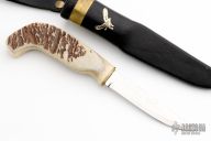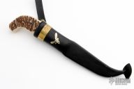 Nice fishing/camp knife from this well known European maker. Extremely sharp. Name etched on blade. Mirror polished scandi ground blade, .117" blade stock and .769" blade depth, hidden tang construction. The handle has a brass guard and a stag grip. Very utilitarian. Comes with a black leather sheath and zippered case. Excellent condition.