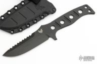 This Fixed Adamas fixed blade combat knife was designed by Shane Sibert. The black finished D2 steel drop point blade has a plain cutting edge and jimping on the spine. The handle is skeletonized with optimally positioned grooves. The Fixed Adamas knife also comes with a black molded sheath with secondary locking strap and tension screw for secure storage and custom tuned deployment.