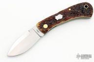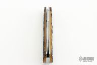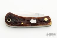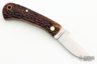 This Nessie Shadow by Matt Collum features a hand rub satin finished blade with nail nick. The handle has bourbon jigged bone covers, bronze pivot, stainless steel liners and spring. Stainless steel escutcheon. Has lanyard hole. Has half-stop, flush in all positions. Comes with a zippered case. New from maker at the 2023 Blade Show. These are as nicely done and as clean as any!