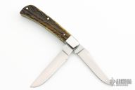 This Modified Trapper by Matt Collum is one of his own patterns. It features hand rub satin finished blades with nail nicks. The handle has stainless steel bolsters, Old Sheffield jigged bone covers, stainless steel liners and springs. Has half-stop, flush in all positions. Comes with a zippered case. New from maker at the 2023 Blade Show. These are as nicely done and as clean as any!