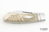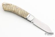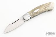 This Dino slipjoint by David Taber features a hand rub satin finished blade with nail nick. The handle has fluted stainless steel bolsters, muskox covers, stainless steel liners, escutcheon and spring. Half stop blade position, flush in all positions. Strong function. Comes with a leather slip sheath and COA dated March 2023. New from maker at the 2023 Blade Show.
