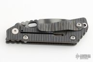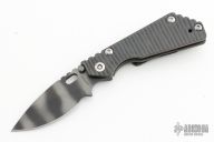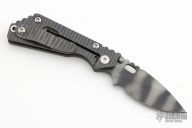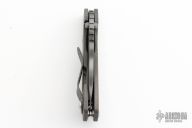 This PT by Mick Strider features a tiger striped blade with notched thumbrest and thumbhole. The handle has a flame finished titanium frame with matching tip up clip. New from Maker!