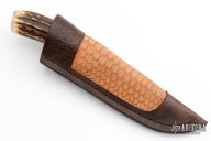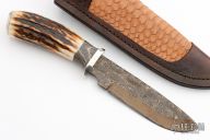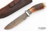 This Hunter by Herb Derr features a Birds Eye Damascus blade with file worked spine, .170" blade stock and 1.257" blade depth, hidden tang construction. The handle is comprised of a nickel silver guard and pommel with bog oak and nickel silver spacer and a stag grip. Includes a brown leather sheath with python skin inlay. Comes with COA. New from maker at the 2023 Blade show.