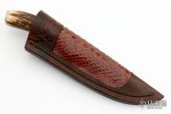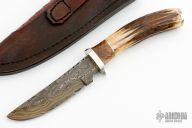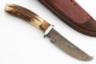 This Skinner by Herb Derr features a Birds Eye Damascus blade with file worked spine, .163" blade stock and .995" blade depth, hidden tang construction. The handle is comprised of a nickel silver guard and pommel with maple burl and nickel silver spacer and a stag grip. Includes a brown leather sheath with boa skin inlay. Comes with COA. New from maker at the 2023 Blade show.