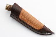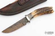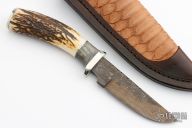 This Skinner by Herb Derr features a Birds Eye Damascus blade with file worked spine, .170" blade stock and 1.021" blade depth, hidden tang construction. The handle is comprised of a nickel silver guard and pommel with buckeye burl and nickel silver spacer and a stag grip. Includes a brown leather sheath with python skin inlay. Comes with COA. New from maker at the 2023 Blade show.