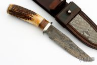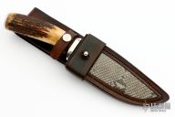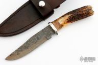 This Hunter by Herb Derr features a Birds Eye Damascus blade with file worked spine, .163" blade stock and 1.138" blade depth, hidden tang construction. The handle is comprised of a nickel silver guard and pommel with maple burl and nickel silver spacer and a stag grip. Includes a brown leather sheath with boa skin inlay. Comes with COA. New from maker at the 2023 Blade show.