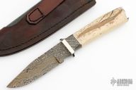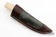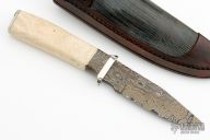 This Hunter by Herb Derr features a Birds Eye Damascus blade with file worked spine, .163" blade stock and 1.172" blade depth, hidden tang construction. The handle is comprised of a nickel silver guard and pommel with bog oak and nickel silver spacer and a walrus jaw bone grip. Includes a brown leather sheath with lizard skin inlay. Comes with COA. New from maker at the 2023 Blade show.