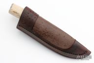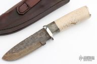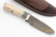 This Hunter by Herb Derr features a Birds Eye Damascus blade with file worked spine, .174" blade stock and 1.363" blade depth, hidden tang construction. The handle is comprised of a nickel silver guard and pommel with buckeye burl and nickel silver spacer and a walrus jaw bone grip. Includes a brown leather sheath with ostrich skin inlay. Comes with COA. New from maker at the 2023 Blade show.