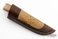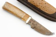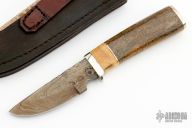 This Skinner by Herb Derr features a Birds Eye Damascus blade with file worked spine, .163" blade stock and 1.068" blade depth, hidden tang construction. The handle is comprised of a nickel silver guard and pommel with maple burl and nickel silver spacer and a sea cow rib bone grip. Includes a brown leather sheath with cane toad skin inlay. Comes with COA. New from maker at the 2023 Blade show.