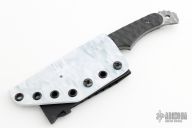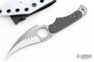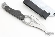 This Kyuss Prototype by Scorpion 6 Knives features a hawkbill double edge blade with notched thumbramp, .17" blade stock and 1.3584" blade depth, full tang construction. The handle has textured g10 scales. Comes with a kydex sheath. Has some scuffs, great condition otherwise.