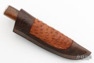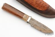 This Hunter by Herb Derr features a Birds Eye Damascus blade with file worked spine, .160" blade stock and .985" blade depth, hidden tang construction. The handle is comprised of a nickel silver guard and pommel with buckeye burl and nickel silver spacer and a sea cow rib bone grip. Includes a brown leather sheath with ostrich skin inlay. Comes with COA. New from maker at the 2023 Blade show.