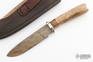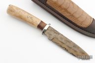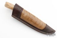 This Hunter by Herb Derr features a Birds Eye Damascus blade with file worked spine, .163" blade stock and 1.132" blade depth, hidden tang construction. The handle is comprised of a nickel silver guard and pommel with maple burl and nickel silver spacer and a oosic grip. Includes a brown leather sheath with ostrich leg skin inlay. Comes with COA. New from maker at the 2023 Blade show.