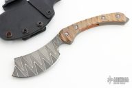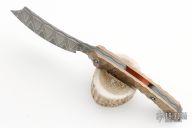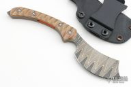 This One Off Hellrazor by Scorpion 6 Knives features a San Mai Damascus blade with .169" blade stock and 1.300" blade depth, full tang construction. The handle has contoured copper scales, Damascus spacer at the butt. Comes with original papers. Has a couple light scuffs, otherwise excellent condition.