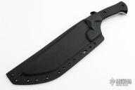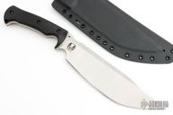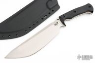 This Nomad Camp Knife by Work Tuff Gear features a satin finished Bohler K340 Steel blade with a saber grind that has a convex cutting edge, .255" blade stock and 2.432" blade depth, full tang construction with black G-10 scales with tan G-10 liners. Comes with a nicely fitted kydex sheath and zippered case. New from maker at the 2023 Blade Show. Dated 11-2022