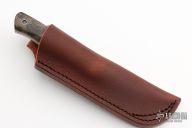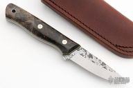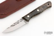 This Trout by Warlander Enterprises features a flat ground drop point blade with spalted flats, .100" thick blade with .927" blade depth, full tang construction. The handle has stormy maple burl scales with natural liner, tiffany pinstripe, Corby bolts and stainless steel lanyard hole. Excellent fit and finish. Comes with a leather sheath, and COA. New from Maker at the 2023 Bladeshow.
