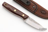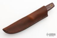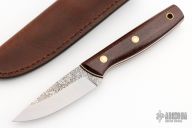 This Fletcher by Warlander Enterprises features a flat ground drop point blade with spalted flats, .099" thick blade with .944" blade depth, full tang construction. The handle has brown burlap scales with natural liner, white pinstripe, Corby bolts and brass lanyard hole. Excellent fit and finish. Comes with a leather sheath, and COA. New from Maker at the 2023 Bladeshow.