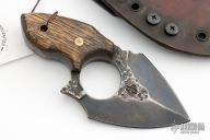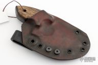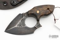 This knife by DG Blade Co features a hand forged blade with notched thumbrest and a finger hole, .251" blade stock and 2.38" blade depth, full tang construction. The handle has bourbon scales with black liners. Comes with a wet formed leather sheath with belt clip. New from Maker!