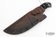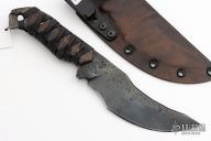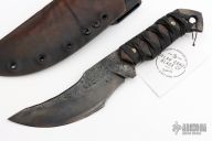 This knife by DG Blade Co features a hand forged blade with .264" blade stock and 2" blade depth, full tang construction. The handle has a ronin wrap with wood liners. Comes with a wet formed leather sheath with belt clip. New from Maker!