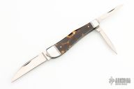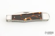 This Splitback Whittler by Bill Ruple features hand rub satin finished blades with nail nicks. All blades are hand rub satin finished and have half-stops, flush in all positions. The handle has pinched and threaded stainless steel bolsters, tortoise shell covers over gold leaf, stainless steel liners and springs, liners have filework on the spines. Includes a padded Velcro case. Excellent Condition.