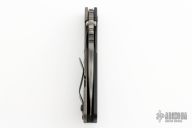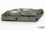 This Mick Strider SNG Fatty framelock folder features a tiger striped blade with thumbhole and notched thumbrest. The handle has a black aluminum and flamed titanium frame with titanium clip, tip up carry.  Lockbar stabilizer. Jimping on blade spine. Has scuffs and scratches, has a little oxidation on the blade, has been used, good user condition.