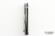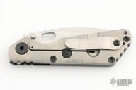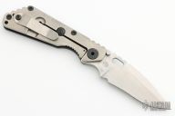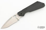 This SNG CC by Strider is a collaboration with the USN, it features a stonewashed recurve blade with notched thumbrest and thumbhole. The handle has a black G-10 and stonewashed titanium frame with matching tip up clip. "USUAL SUSPECT" on the handle. Nice detent, lockup and blade seating. Excellent condition.