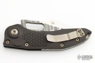 This Stitch Auto is a collaboration between Anthony Marfione and Sebastian Berenji. It features a hand ground blade with Borka pattern flats and false top edge, notched thumb and finger rests. The handle has a black anodized and milled aluminum handle with a Borka pattern titanium backspacer and a bronzed clip, tip up carry, lanyard hole at the butt. Has bronzed stainless steel hardware and flamed titanium backspacer. Excellent condition. Comes with original box, zippered case and COA. Dated 11/2016