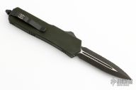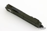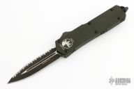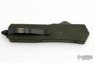 This Executive Scarab OTF auto by Microtech has a black D/E blade with a fully serrated edge with fullers. The handle is OD Green aluminum with a single glass breaker, tip down black stainless steel clip. All black hardware. Dated 11/2010 and S/N 04807. Comes with original sheath, box and papers. Excellent condition.