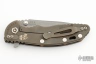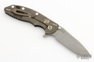 This FATTY XM-18 from Rick Hinderer features a working finish blade S35VN blade. The handle has a custom Aramics carbon fiber scale and working finish titanium frame and pocket clip. Dual thumb studs and notched thumb rest. This is an XM-18 built on XM-24 hardware. A thick beast of a knife! Reversible pocket clip. Strong lock up, nice detent and blade seating is center. Copper standoffs.Comes in the original packaging. Excellent condition. Comes with original G-10 scale.