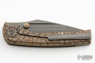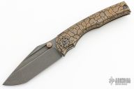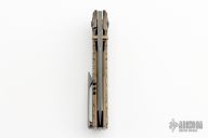 This BBM V2 by Nick Chuprin and Robert Carter features an acid-wash blade with titanium thumbstuds. The handle has a milled titanium frame with tumbled and anodized finishes (laser engraved cracked ice), two pice titanium/zirconium pivot, matching zirc backspacer and tip up clip with hidden screws. Large chamfer and false liner frame option. Rides on Skiff Made bearings, nice detent, lockup and blade seating. Comes with a zippered case and COA. New from maker.