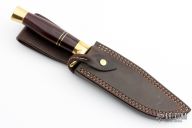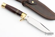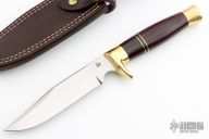 This Cooper Style Hunter by Journeyman Smith Rich McDonald features a mirror finished blade with a sharpened top edge and notched thumbrest, .218" blade stock, 1.102" blade depth, hidden tang construction. The handle has a John Cooper style brass guard, spacers and butt cap, and a maroon linen micarta grip. Comes with a brown leather sheath. Excellent condition. Well done!